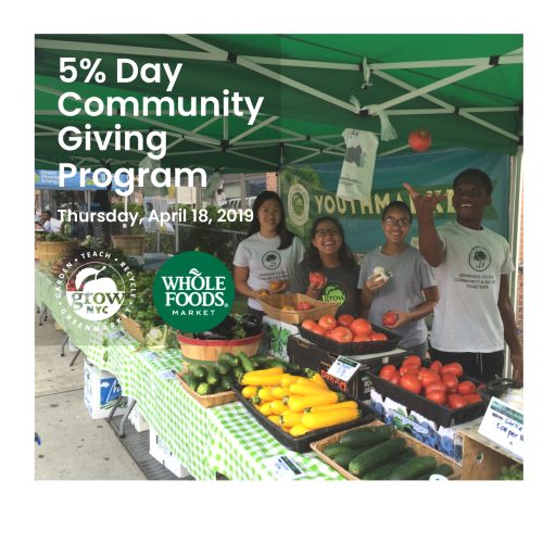Please join GrowNYC for the Whole Foods 5% Day Community Giving Program on Thursday, April 18. 5% of all sale proceeds made at Whole Foods Market locations in Manhattan will go to GrowNYC – supporting neighborhood Youthmarkets, food access programs, community...