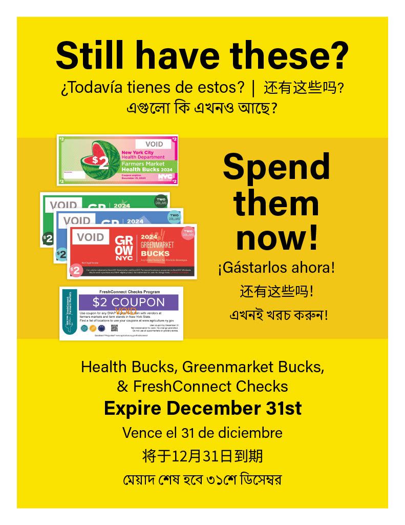 December 10, 2024 Health Bucks, Greenmarket Bucks, and FreshConnect checks will expire December 31st